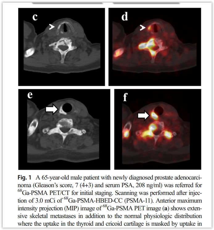 şimdiye kadar yayınlanmıştır. Bu olguda, yakın zamanda prostat adenokarsinoması tanısı konan, 68Ga-PSMA PET/BT ile evreleme için başvuran 65 yaşında bir erkek hasta sunuldu. Kıkırdak ile birlikte yaygın iskelet sistemi metastazı olduğu görüldü. Hem Tiroid ve hem de krikoid kıkırdak metastazı tespit edildi.