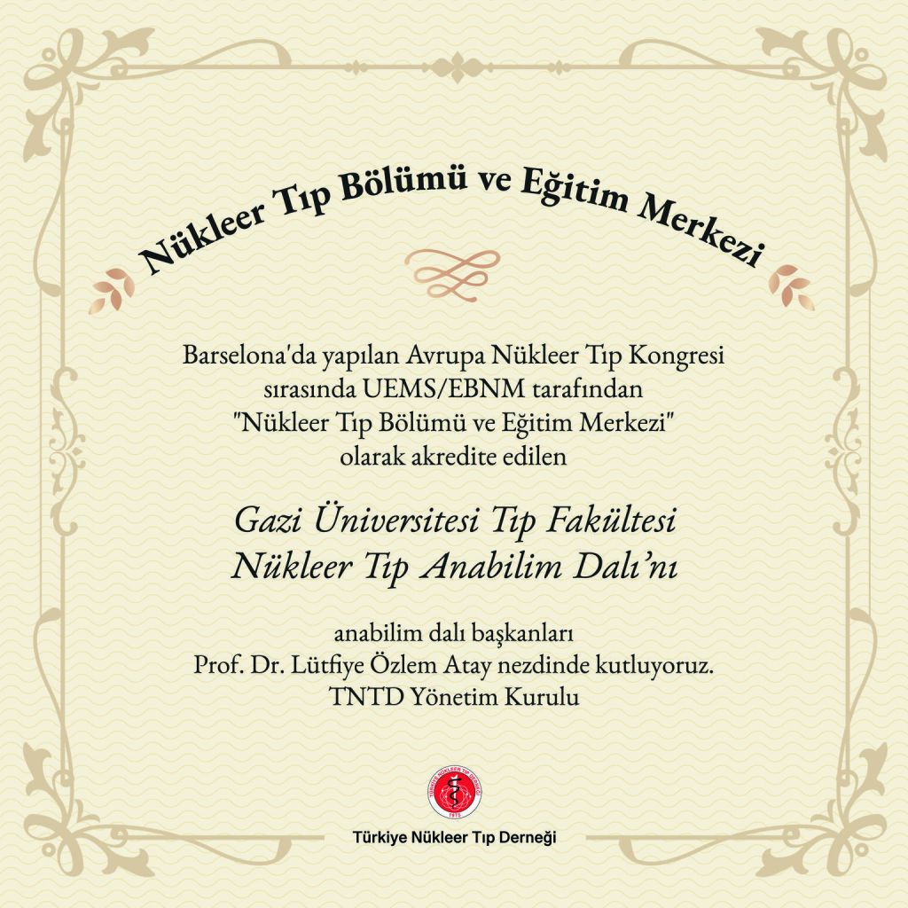 Gazi Üniversitesi Tıp Fakültesi Nükleer Tıp Anabilim Dalı, European Union of Medical Specialists Section and Board of Nuclear Medicine (UEMS/EBNM) komitesi tarafından hem bölüm hem de eğitim merkezi olarak akredite edildi. 2022-2026 yılları için akredite edilen Gazi Üniversitesi Nükleer Tıp Anabilim Dalı, bu alanda güncel akreditasyona sahip Türkiye’deki tek, Avrupa’daki yedi bölümden biri olmayı başardı.